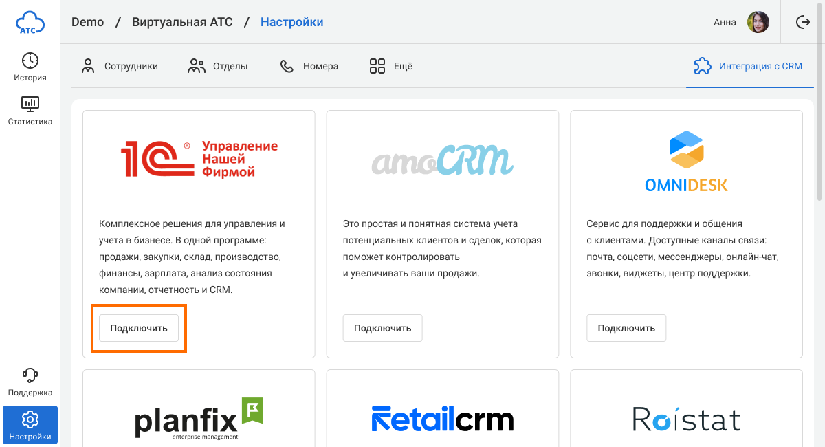 1. В Виртуальной АТС перейдите в раздел «Настройки» – «Интеграция с CRM» – «1С:Управление Нашей Фирмой». Нажмите на кнопку «Подключить».