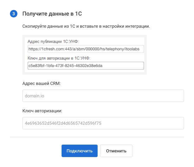 Вставьте эти данные в настройках интеграции ВАТС в поля «Адрес вашей CRM» и «Ключ авторизации» соответственно.