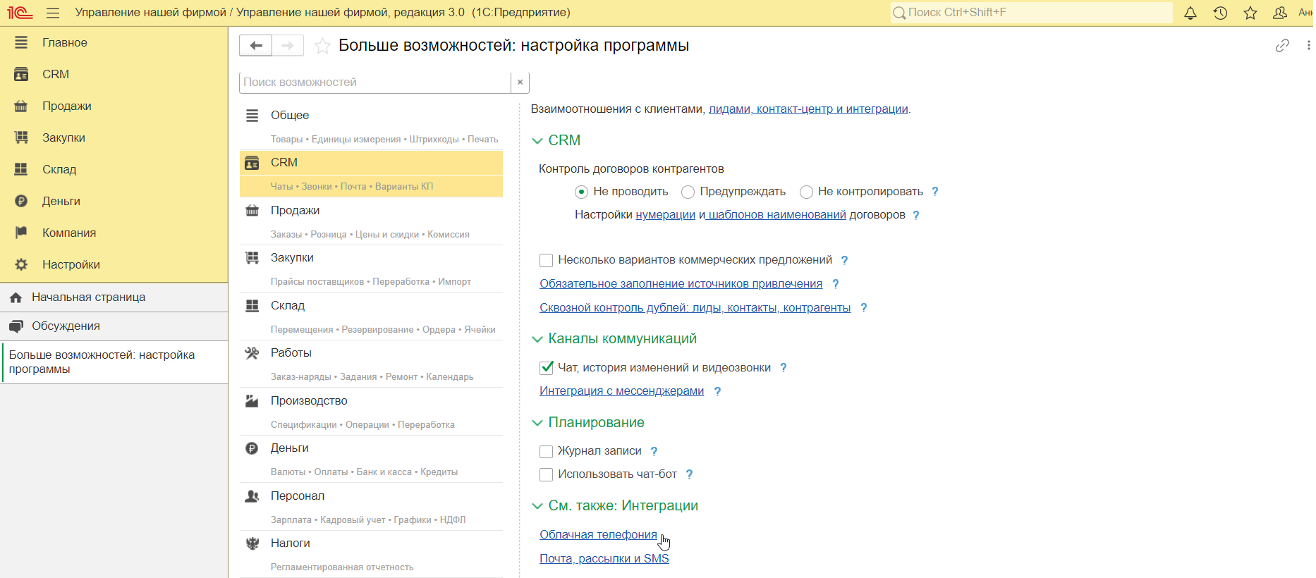 3. В 1С перейдите в раздел «Настройки» – СRM – «См. также: Интеграции» – «Виртуальная телефония».
