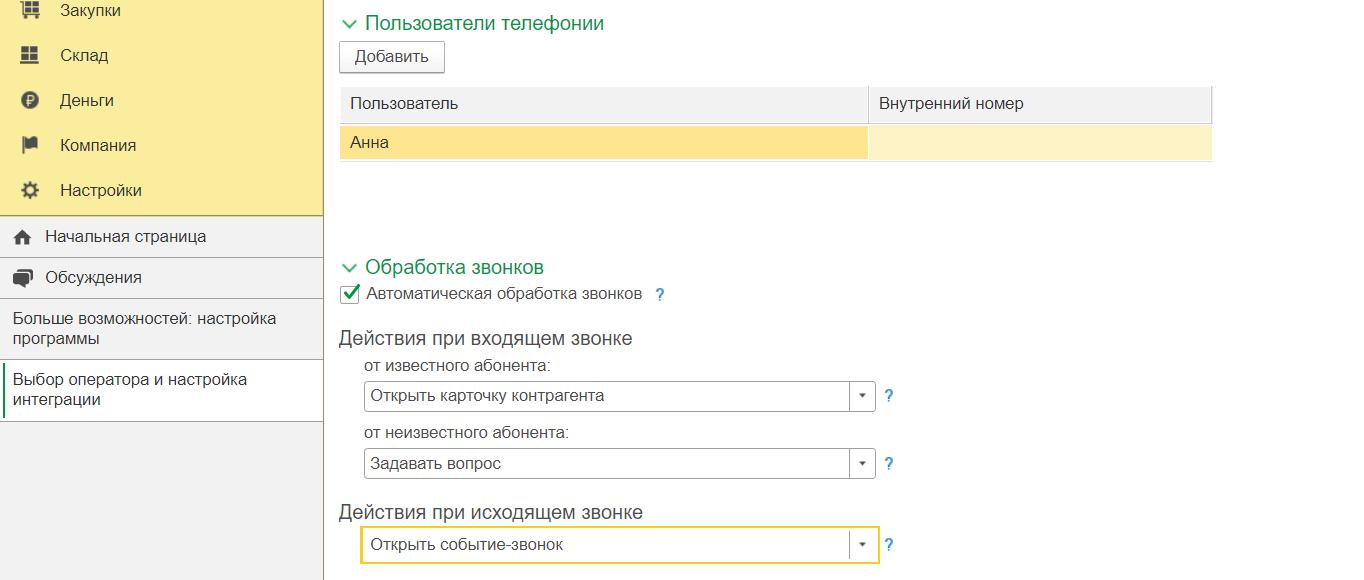 6. Вернитесь в настройки 1С и ниже добавьте сотрудников. Укажите, нужно ли переадресовывать звонки известных клиентов на персональных менеджеров, а также настройте действия при входящем звонке.