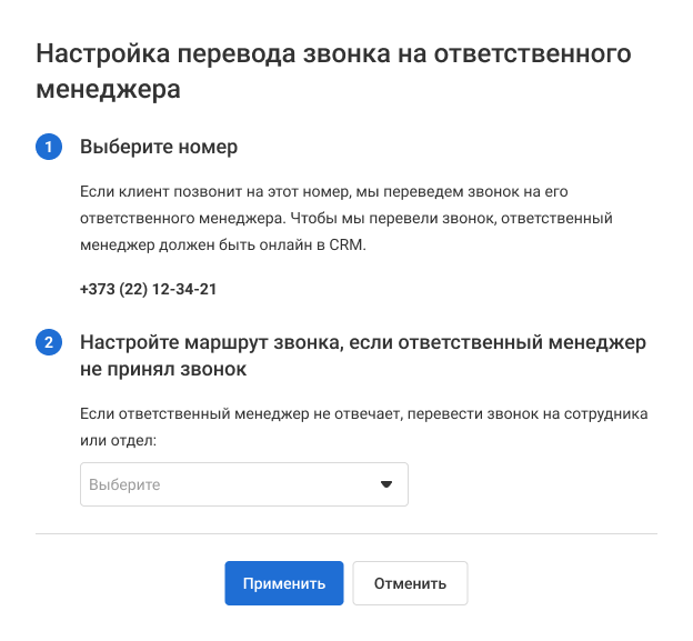 8. В самом низу в настройках вы можете включить возможность перенаправлять звонки от клиентов на ответственных менеджеров, если же они не ответят – отправлять этот звонок на конкретного менеджера или отдел.