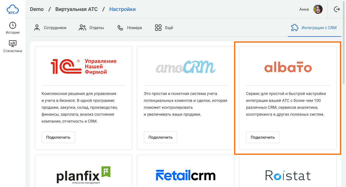 1. В настройках Облачной АТС перейдите в раздел «Интеграция с CRM». В списке интеграций найдите виджет Albato, нажмите «Подключить».