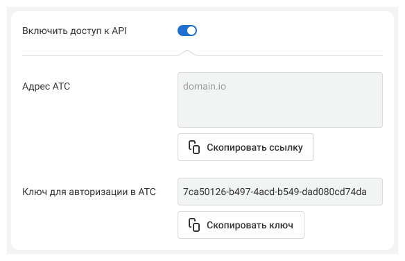 2. Включите доступ по API. Скопируйте адрес вашей АТС и ключ для авторизации.