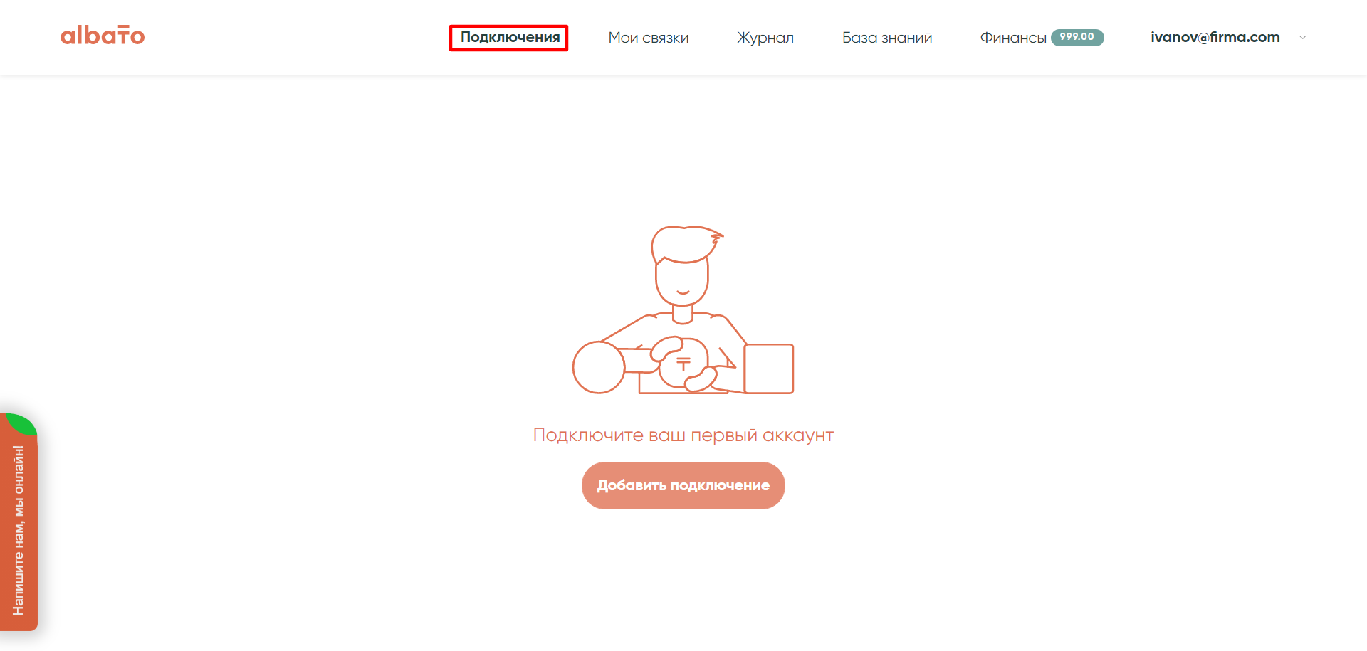 3. В новом окне зайдите в свой личный кабинет сервиса Albato. Выберите меню «Подключения» и нажмите кнопку «Добавить подключение».
