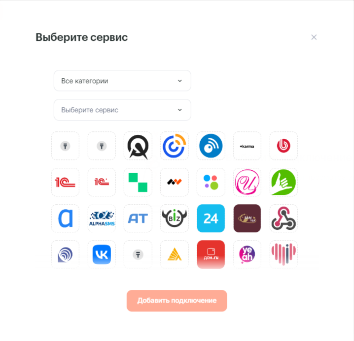 4. В списке доступных сервисов выберите Облачную АТС и нажмите кнопку «Добавить подключение».