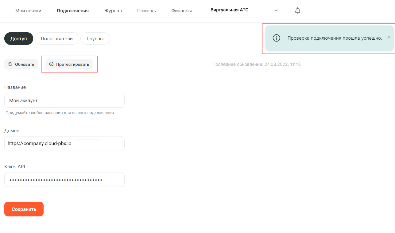 - Ключ API – вставьте скопированное значение поля «Ключ для авторизации в АТС».