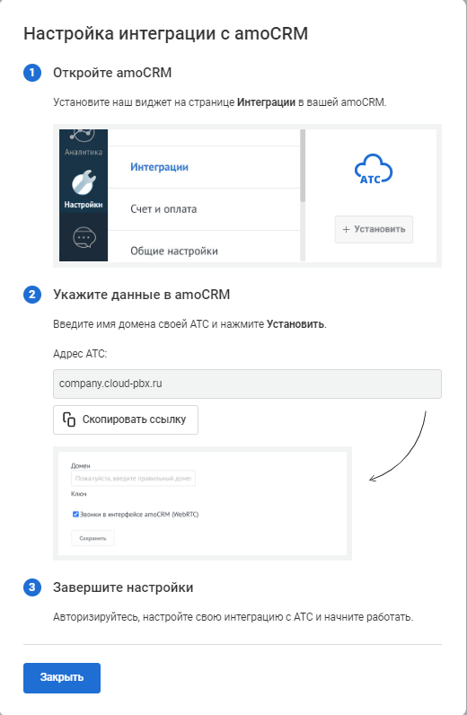1. В вашей Виртуальной АТС зайдите в меню «Интеграция с CRM». Найдите виджет amoCRM и кликните на него. В открывшемся окне скопируйте имя домена своей Виртуальной АТС.