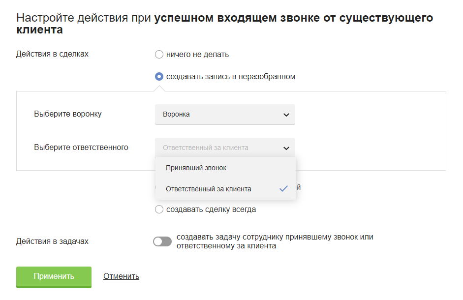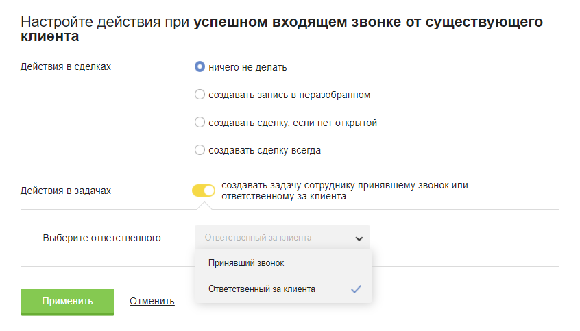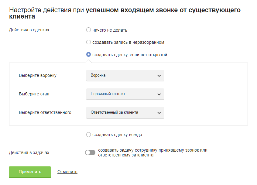 Вы можете настроить сценарии интеграции отдельно для входящих звонков: