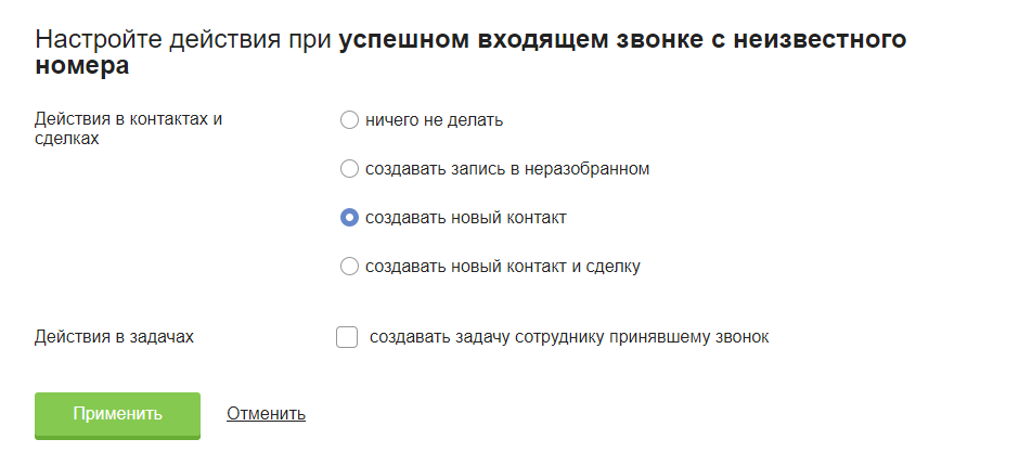 • После звонка с участием неизвестного номера (успешного и неуспешного, входящего и исходящего) в amoCRM кроме сделки, записи в неразобранном и задачи может автоматически создаваться контакт.