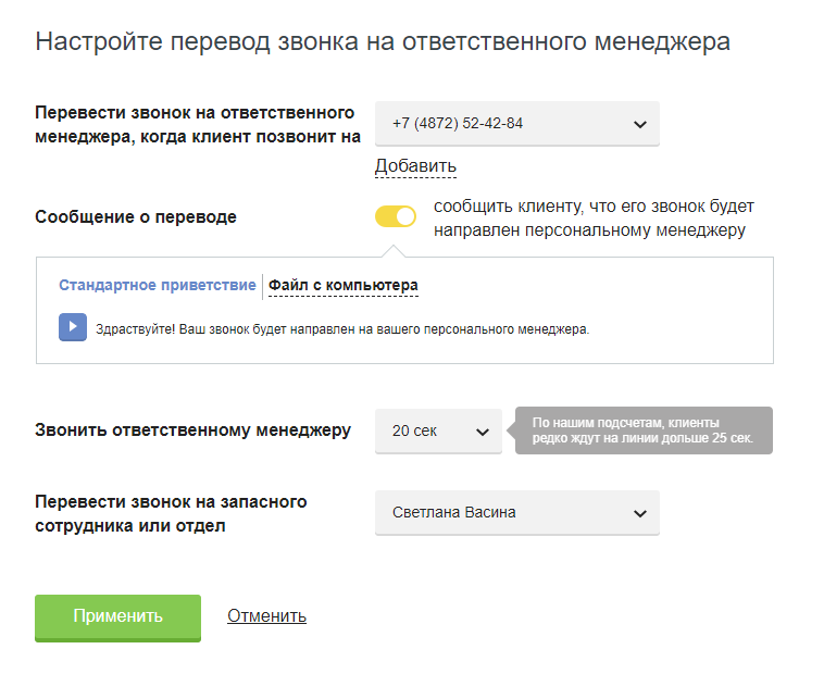 В этом случае клиенту больше не придется слушать голосовое меню, общаться с секретарем или другими менеджерами. Облачная АТС сразу переведет звонок на ответственного менеджера.