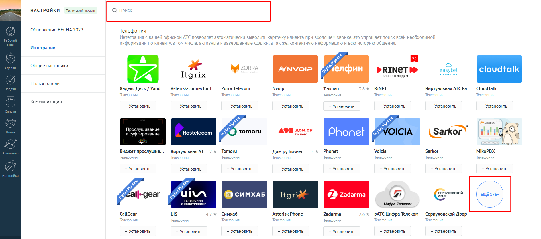 2. В интерфейсе вашей amoCRM перейдите в «Настройки», далее – «Интеграции». В списке доступных интеграций найдите нужный виджет (либо воспользуйтесь поиском). Нажмите «Установить».