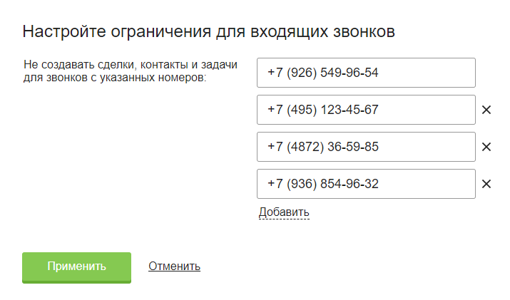 • Для определенных номеров (например, телефоны подрядчиков, охраны, родственников и т.п.) можно настроить ограничение – они будут просто фиксироваться в amoCRM, но сделки, контакты и заказы для этих звонков создаваться не будут.