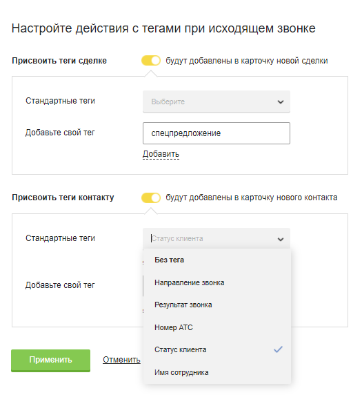 • Если вам нужно настроить более гибкие фильтры для работы с новыми клиентами, вы можете автоматически добавлять специальные теги к сделкам и контактам. Теги можно выбрать из предложенных стандартных или придумать свои собственные.