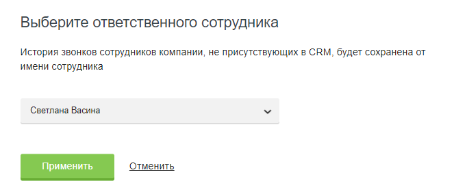 • История звонков ваших сотрудников, не присутствующих в amoCRM, будет сохранена от имени выбранного пользователя. Этой опцией можно пользоваться, если вы не сопоставили всех менеджеров или если у вас есть сотрудники, которые не работают в amoCRM, но могут звонить клиентам (бухгалтер, курьер и т.п.)