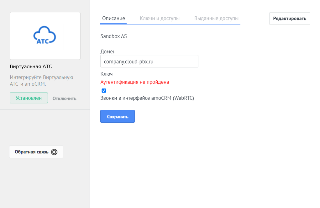 3. В открывшемся окне вставьте адрес вашей Облачной АТС. Если вы хотите делать звонки прямо в интерфейсе amoCRM, попробуйте функционал WebRTC (поставьте галку). Но если вы впервые пользуетесь данной интеграцией, можете обойтись стандартным вариантом. Нажмите «Сохранить».