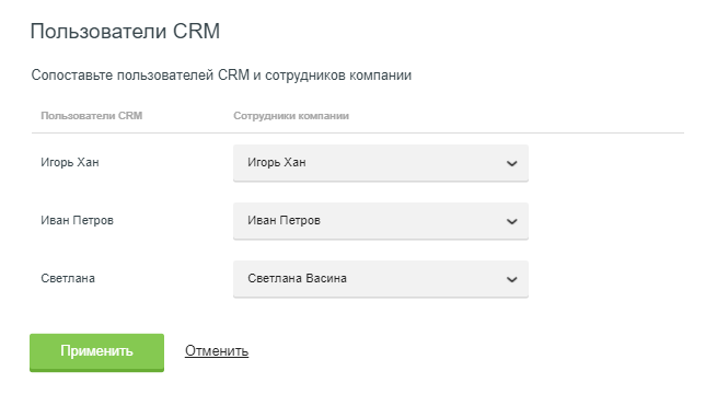 4. На следующем шаге сопоставьте всех пользователей Облачной АТС с пользователями amoCRM и нажмите «Применить». Это необходимо, чтобы системы могли однозначно идентифицировать сотрудников и правильно отражать связанные с ними события. В amoCRM будут заноситься звонки только сопоставленных пользователей. Если в будущем вы добавите новых сотрудников, не забудьте сделать сопоставление в настройках интеграции из личного кабинета Облачной АТС.