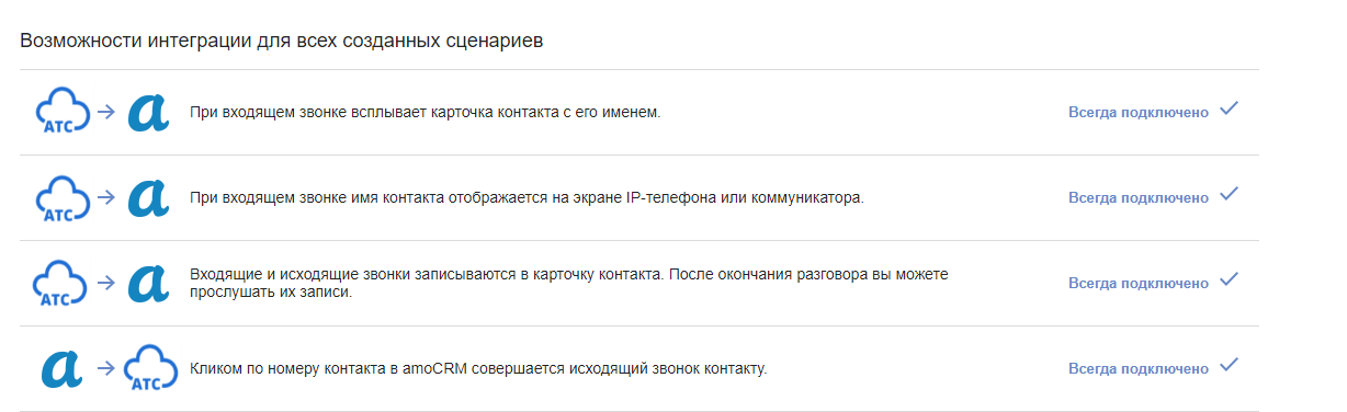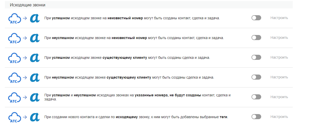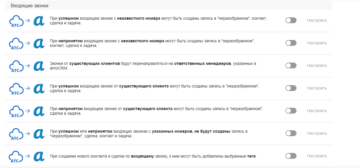 5. Настройте сценарии (правила) интеграции amoCRM и Облачной АТС. Некоторые сценарии интеграции подключаются автоматически без возможности внести в них изменения.
