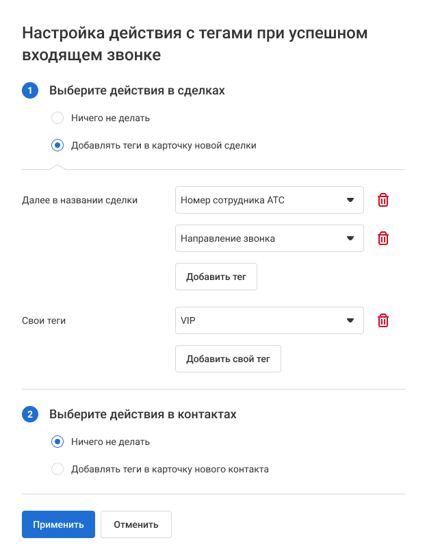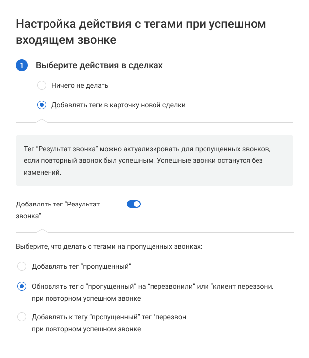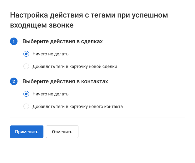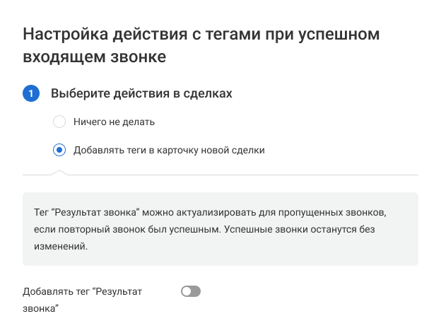 2. В открывшемся окне выберите, что делать при успешном входящем звонке: добавлять теги в сделки или контакты или не добавлять.