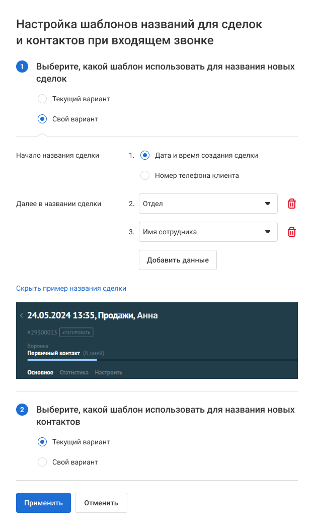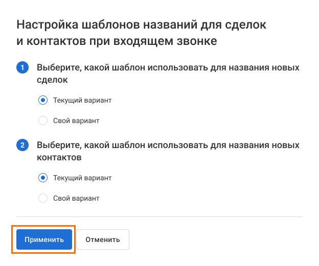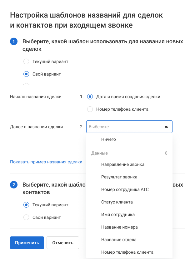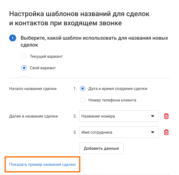3. В меню ниже выберите, с чего будет начинаться название сделки при входящем звонке: дата и время создания сделки или номер телефона клиента. По этим параметрам проще всего отличить одну сделку от другой.