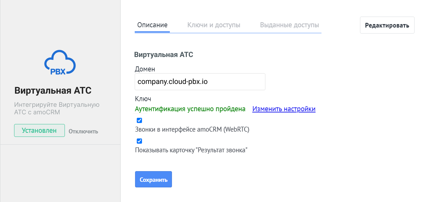 В amoCRM зайдите в раздел «Настройки» — «Интеграции» — «Виртуальная АТС», выберите «Звонки в интерфейсе amoCRM (WebRTC)» и «Показывать карточку «Результат звонка»».