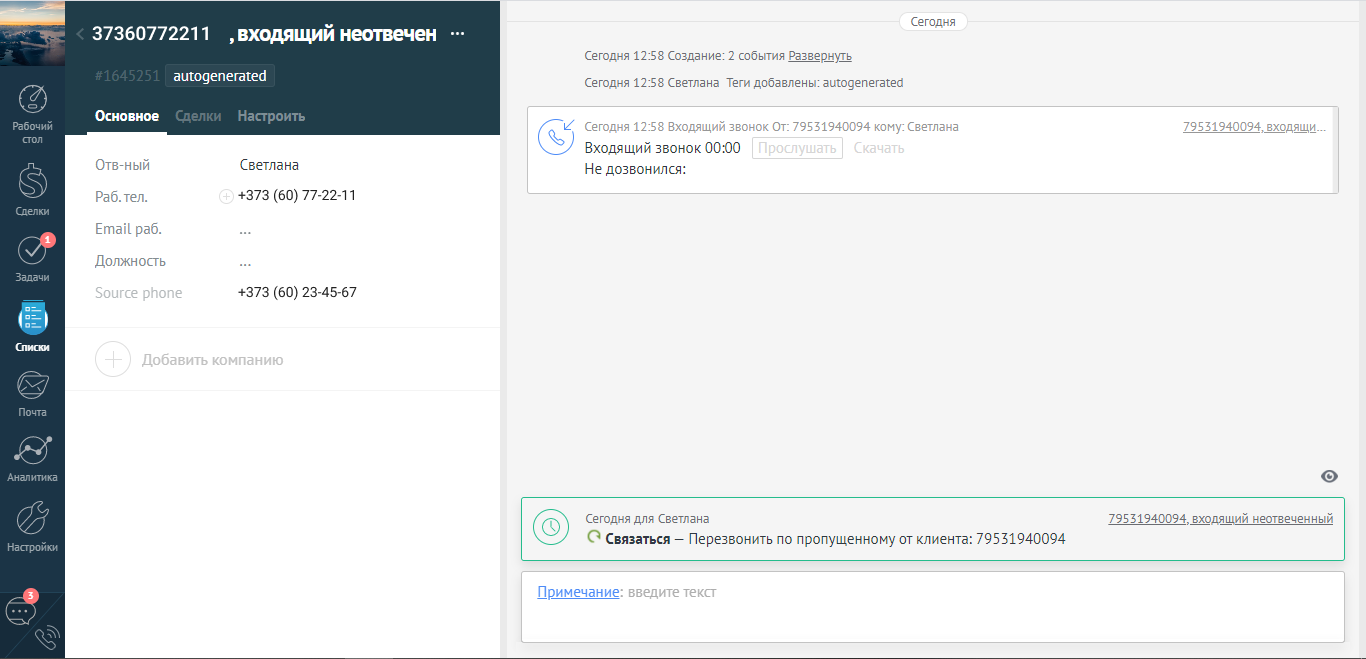 • Автоматическое создание сделок, контактов, задач и записей в неразобранном.