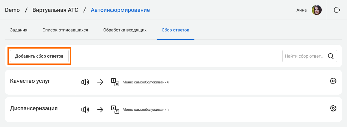1. Откройте вкладку «Автоинформирование» – «Сбор ответов».