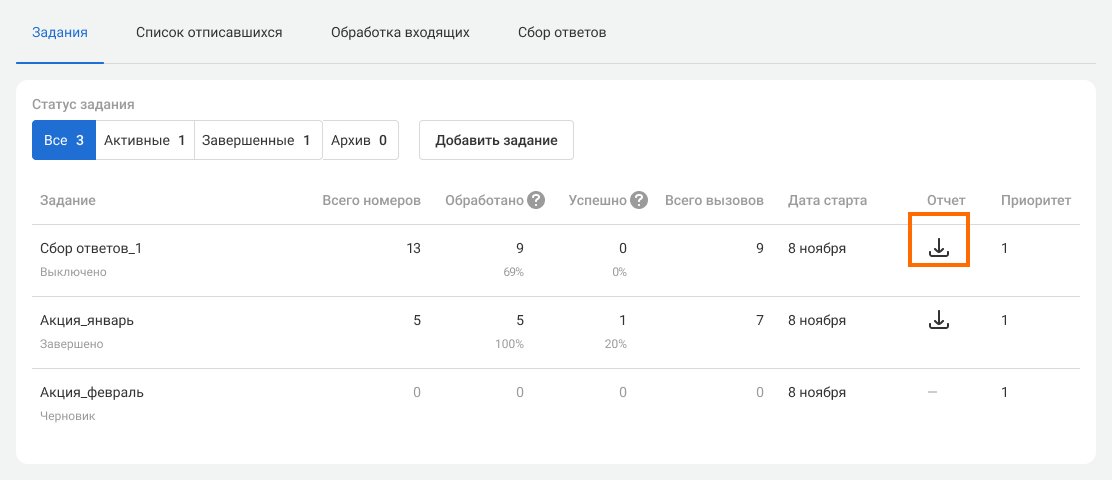 2. Кликните на иконку скачивания отчета напротив интересующего вас задания.