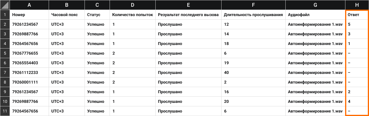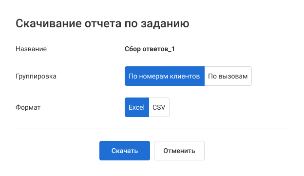5. Откройте скачанный файл. В столбце «Отчет» вы увидите, какую кнопку каждый клиент нажал в процессе опроса.