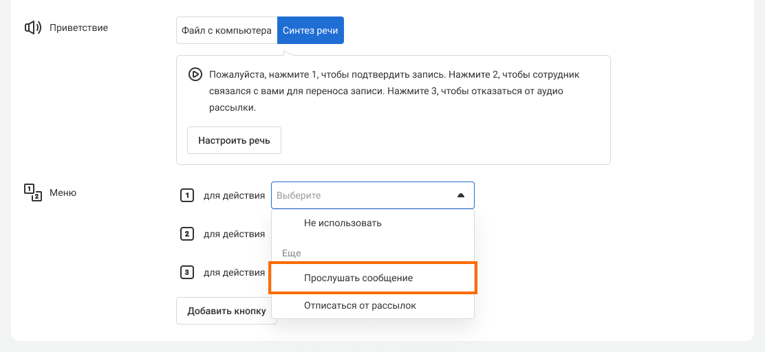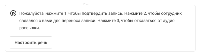 Пример сообщения для опроса: «Пожалуйста, нажмите 1, чтобы подтвердить запись. Нажмите 2, чтобы сотрудник связался с вами для переноса записи. Нажмите 3, чтобы отказаться от аудиорассылки.»