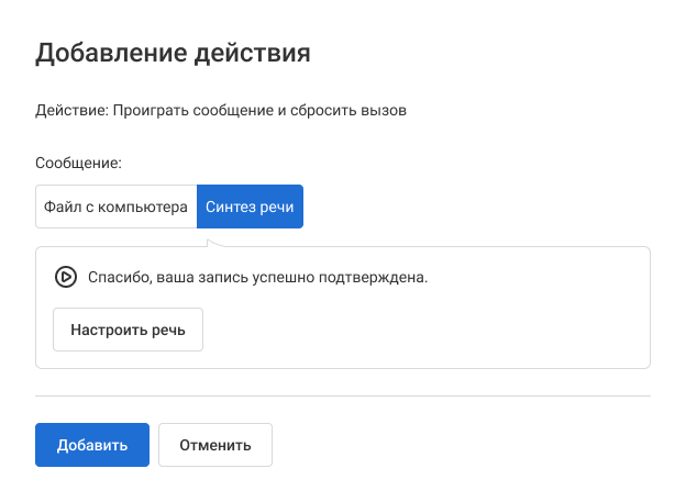 В нашем примере нажатие на кнопку 1 подтверждает запись. Значит, для кнопки 1 можно добавить следующее аудиосообщение: «Спасибо, ваша запись успешно подтверждена.»