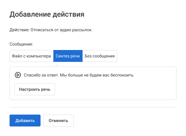Для действия «Отписаться от рассылок» можно выбрать настройку «Без сообщения», тогда звонок для клиента завершится сразу после нажатия соответствующей кнопки.
