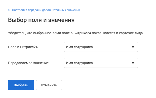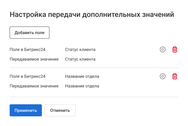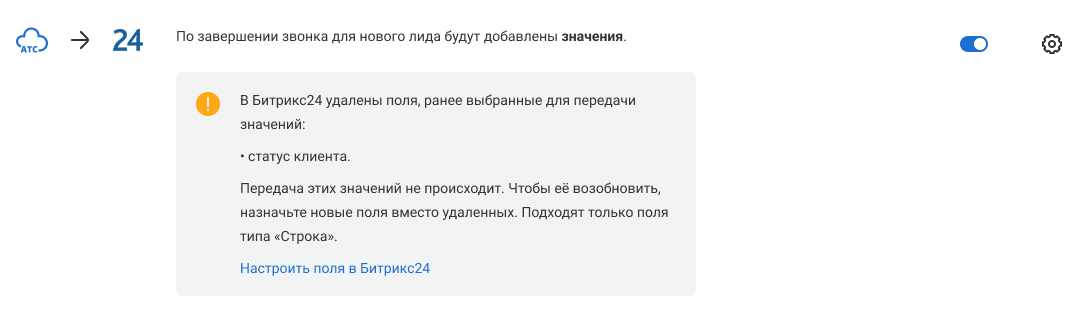 Чтобы возобновить передачу данных, добавьте поле в Битрикс24 и заново сопоставьте его в АТС с нужным значением.