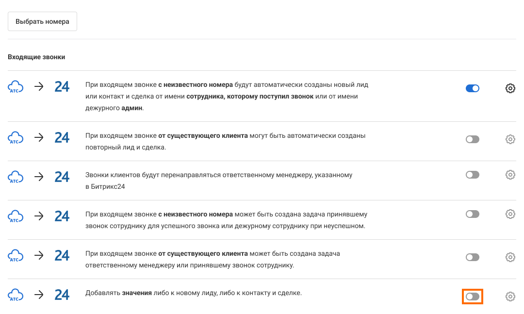 1. В интерфейсе АТС перейдите в: «Настройки» — «Интеграция с CRM» — «Интеграция с Битрикс24» — сценарии интеграции для входящих звонков. 2. Включите автоматическое создание лидов, контактов и сделок в интерфейсе АТС.