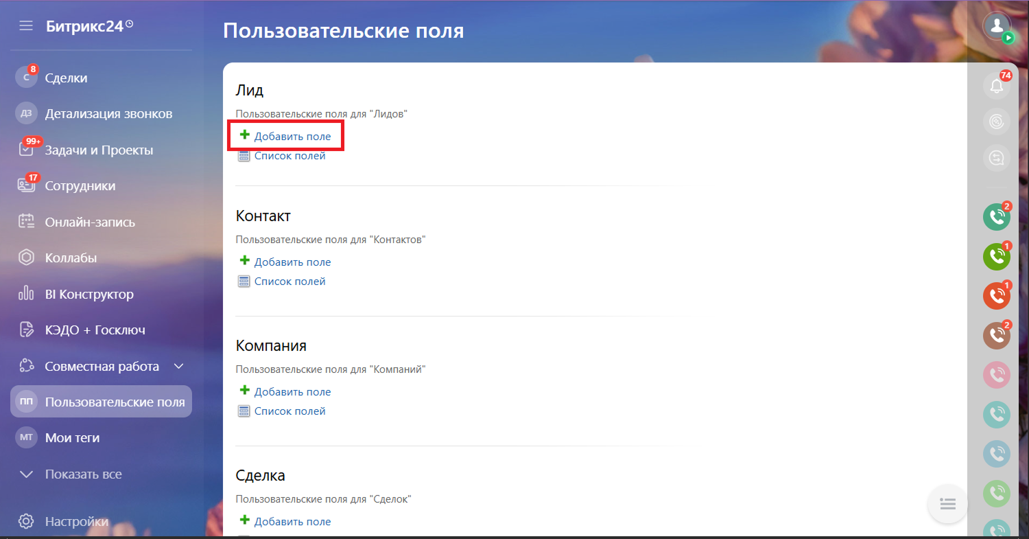1. В Битрикс24 перейдите в раздел «Пользовательские поля» — «Лид» и нажмите «Добавить поле».