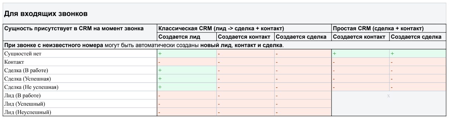 Только для исходящих: если предыдущий лид от этого клиента стал сделкой, то при звонке создаётся повторный лид. Если предыдущий лид стал контактом, то повторный лид не создается.