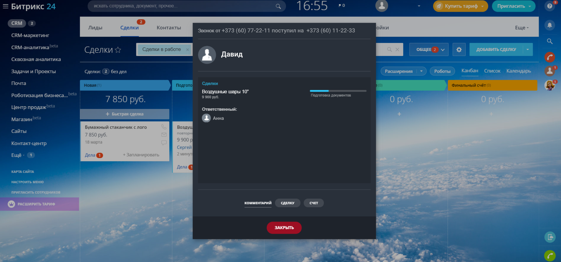 Битрикс24 – популярный сервис для управления бизнес-процессами. Система включает в себя инструменты для организации работы компании, роста продаж и автоматизации бизнеса, в том числе модуль CRM для ведения клиентов по всем этапам воронки продаж. Интегрировав Облачную АТС и Битрикс24, вы сможете автоматически сохранять историю и записи телефонных разговоров в CRM, создавать сделки и лиды, уведомлять менеджеров о звонках клиентов и т.д.