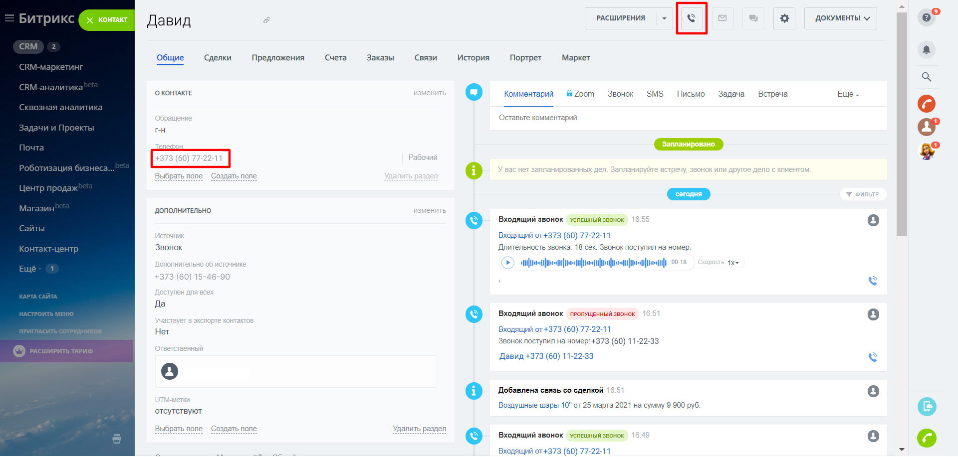 Если у контакта есть открытая сделка, менеджер увидит это в карточке и сможет по клику перейти к деталям сделки, чтобы быстро дать ответы на все вопросы клиента. Позвонившему будет приятно, что о нем помнят и держат его заказ под контролем.