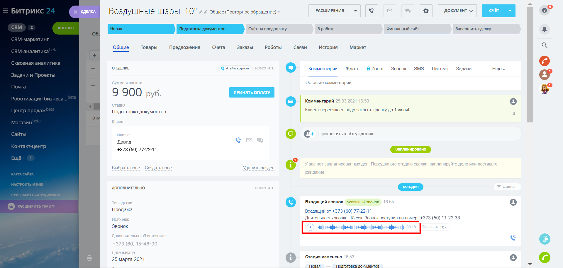 Запись состоявшегося разговора будет автоматически добавлена в лид или сделку после окончания разговора – ее можно прослушать в любое время, например, чтобы правильно написать имя контакта и уточнить пожелания клиента.