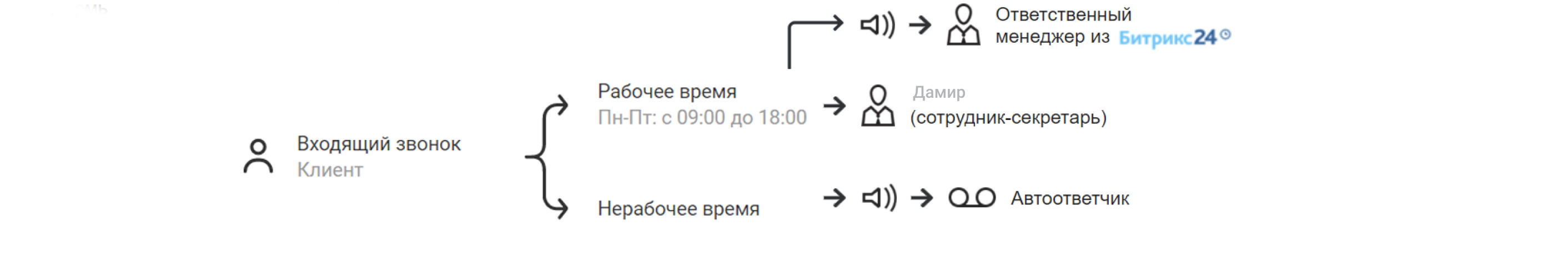 Если вы закрепляете за клиентами персональных менеджеров, соединяйте их автоматически – клиенту не придется слушать голосовое меню, общаться с секретарем или другими менеджерами. Как только он наберет номер вашей компании, Облачная АТС распределит звонок на менеджера, ответственного за этого клиента.