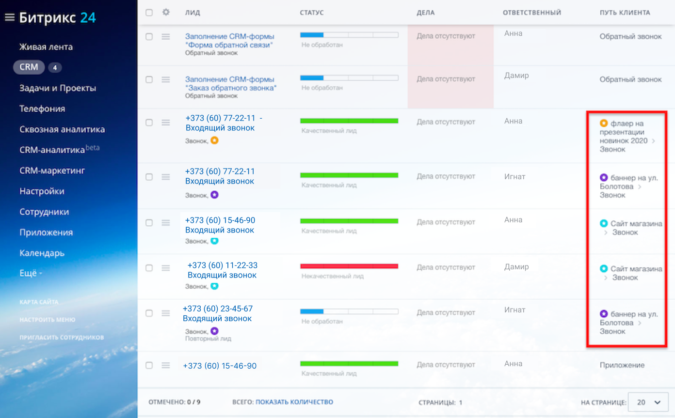 Если вы настроите интеграцию с Облачной АТС, вам станет доступна сквозная аналитика и коллтрекинг от Битрикс24. Вы сможете настроить источники трафика и связать с ними номера вашей ОАТС. При звонках клиентов на эти номера, данные о лидах и сделках с указанием источников трафика будут фиксироваться в отчетах Сквозной аналитики.