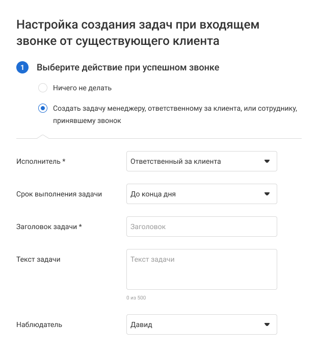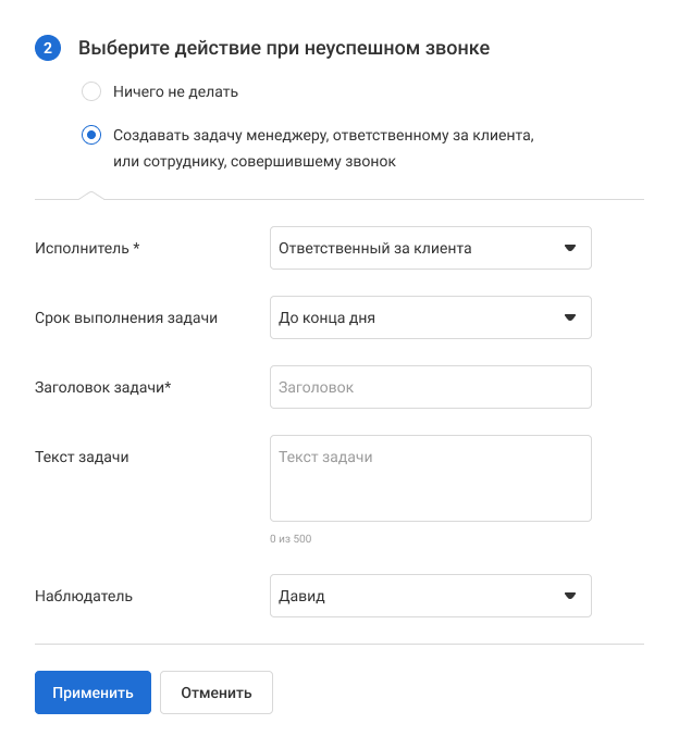 Для этого вам нужно выбрать в настройках сценария ответственного за задачу и наблюдателя, который сможет контролировать ход и результат выполнения задачи (например, руководитель). Затем введите заголовок и в случае необходимости более подробно опишите задачу в поле «Текст задачи». Эти настройки могут быть разными для успешных и неуспешных звонков.