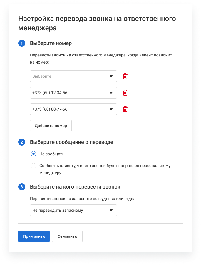 В этом случае клиенту больше не придется слушать голосовое меню, общаться с секретарем или другими сотрудниками. Виртуальная АТС сразу переведет звонок на ответственного менеджера (по желанию вы можете включить автоматическое аудиосообщение, которое предупредит клиента об этом).