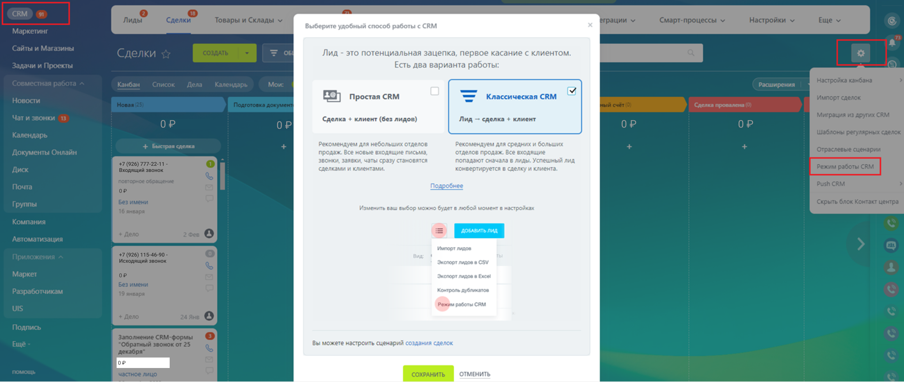 В открывшемся окне отметьте, какой режим CRM вы будете использовать, и нажмите кнопку «Сохранить».