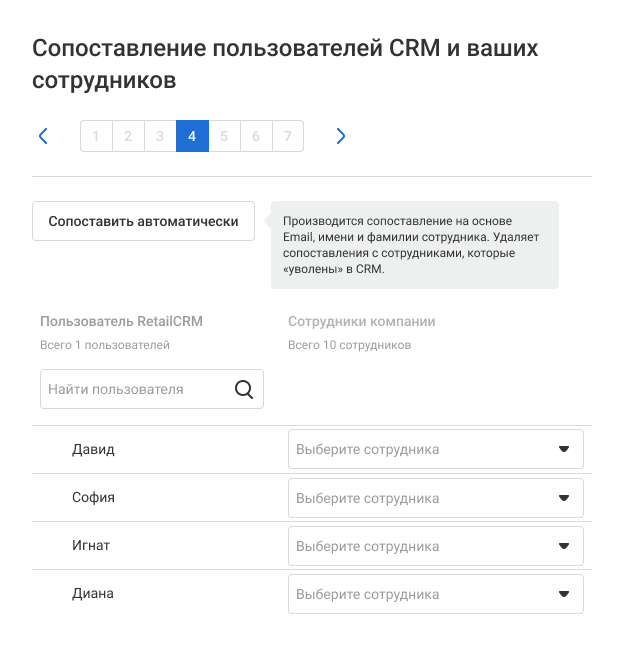 4. На первом шаге настройки интеграции сопоставьте всех пользователей Виртуальной АТС с пользователями Битрикс24. Это необходимо, чтобы системы могли однозначно идентифицировать сотрудников и правильно отражать связанные с ними события.