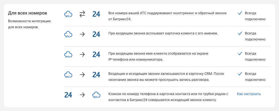 Это описание старой интеграции. В марте 2024 года Виртуальная АТС выпускает продвинутую интеграцию с Битрикс24. Чтобы воспользоваться всеми преимуществами новой интеграции, вам потребуется ее обновить по инструкции.Здесь описывается процесс настройки старой интеграции. Если вас интересует описание возможностей старой интеграции, перейдите в соответствующую статью.
