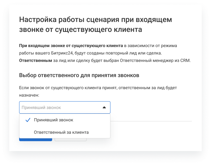Например, если звонок поступил от существующего клиента, то ответственным за лид может быть назначен сотрудник, принявший звонок, либо ответственный за контакт.