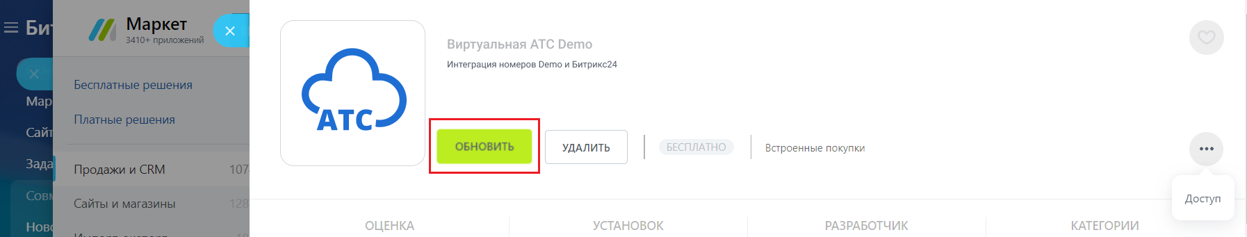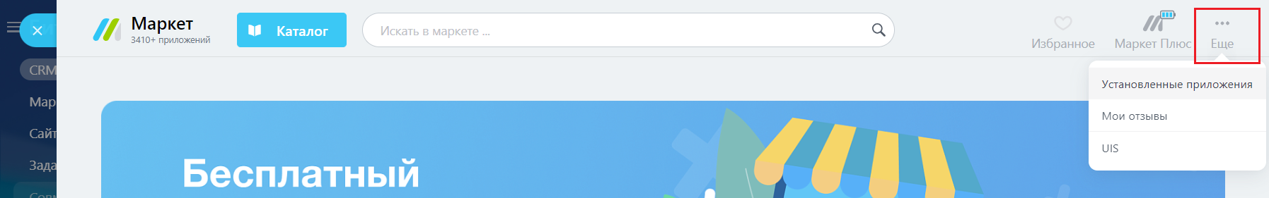 Авторизуйтесь в Битрикс24 и перейдите в раздел «Маркет». Найдите интеграцию с вашей АТС: либо нажмите на кнопку «Еще» – «Установленные приложения», либо введите название оператора в поисковую строку.