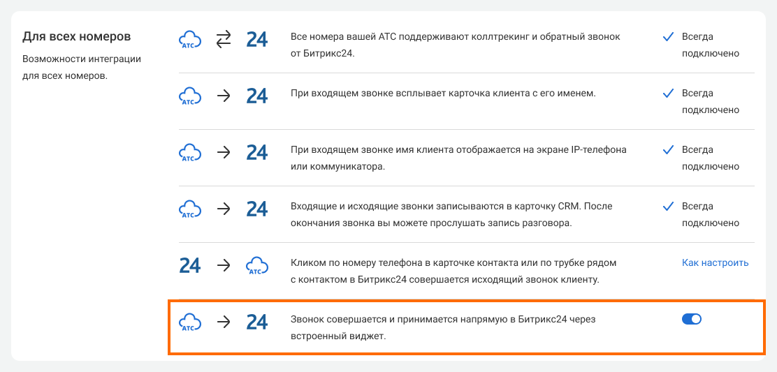 В интерфейсе ОАТС включите сценарий звонка через виджет – передвиньте переключатель слева направо.