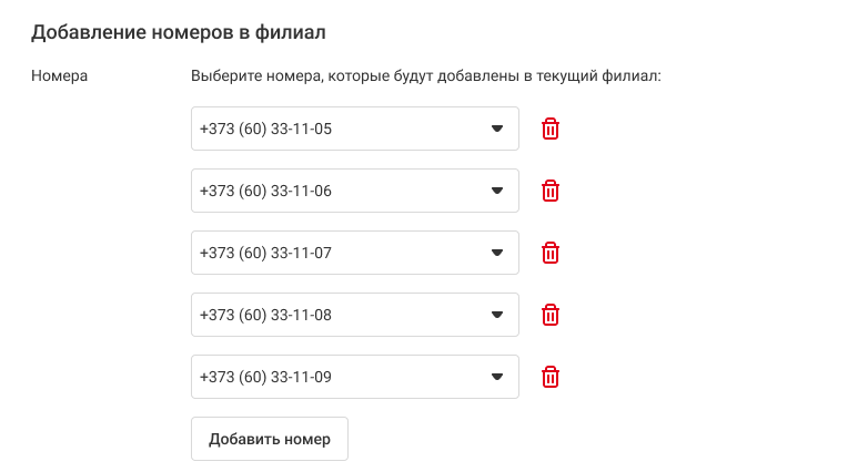 4. Для добавления еще одного номера нажмите на кнопку «Добавить номер». Чтобы удалить случайно добавленный номер, нажмите на корзину справа.