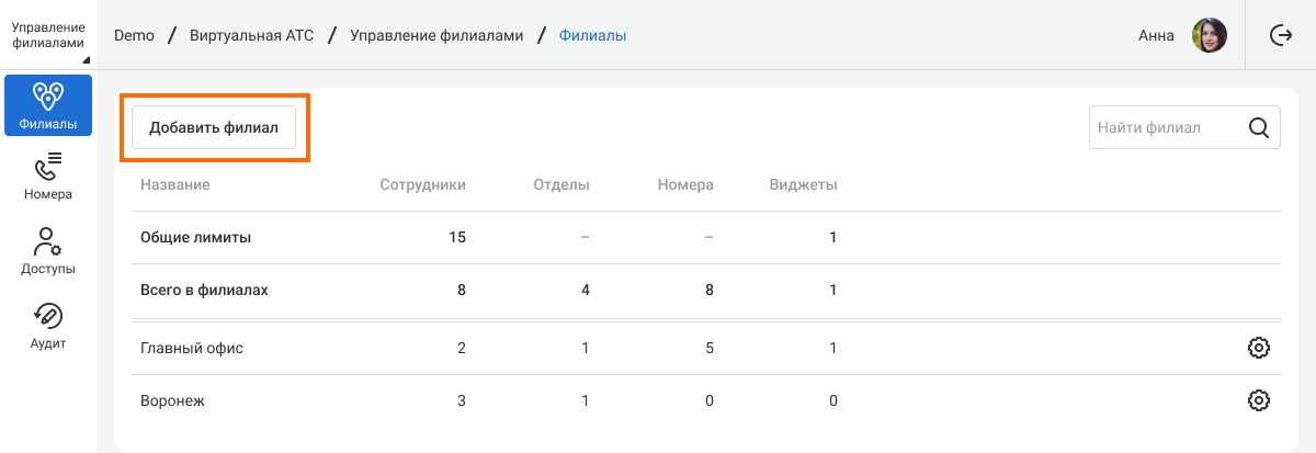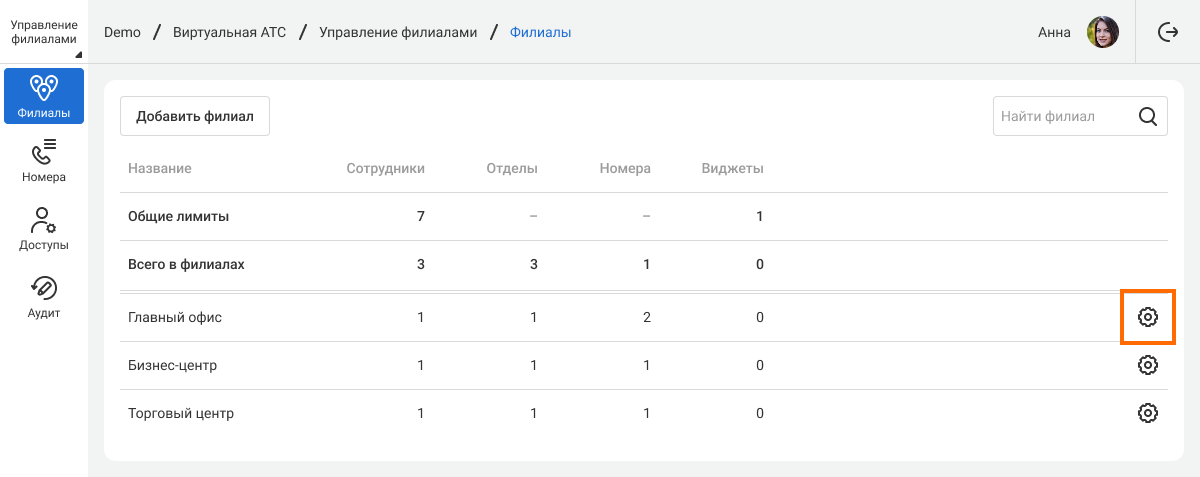 1. Чтобы перейти в настройки определенного филиала, нажмите на шестеренку в соответствующей строке.